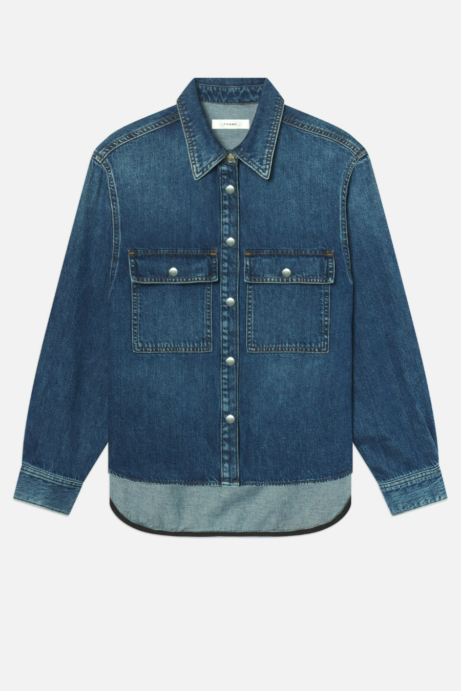Cut from non-stretch denim, this button-down has an exaggerated shirttail hem for easy layering. Wear it buttoned up or open over knits and tanks.