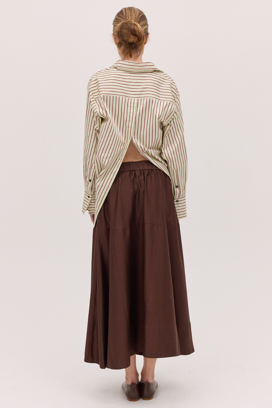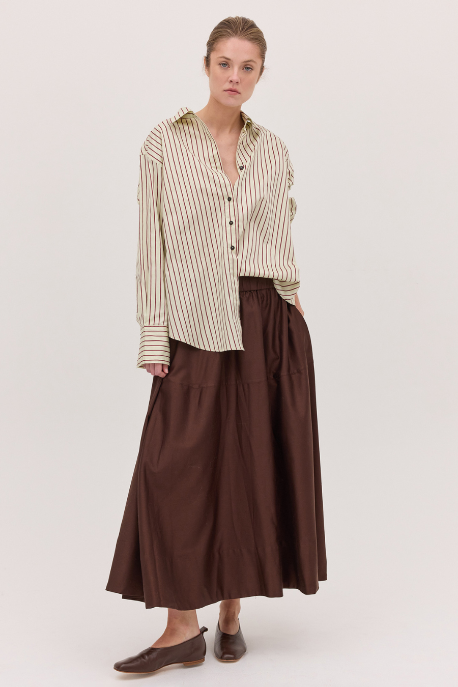 Introducing The Maxi Skirt, a voluminous silhouette, that is lightweight yet perfectly dramatic. Crafted from 100% Giza cotton, this skirt offers a luxurious glow and elegant drape. A maxi-length with flat pockets, elastic high-waist and french seams.