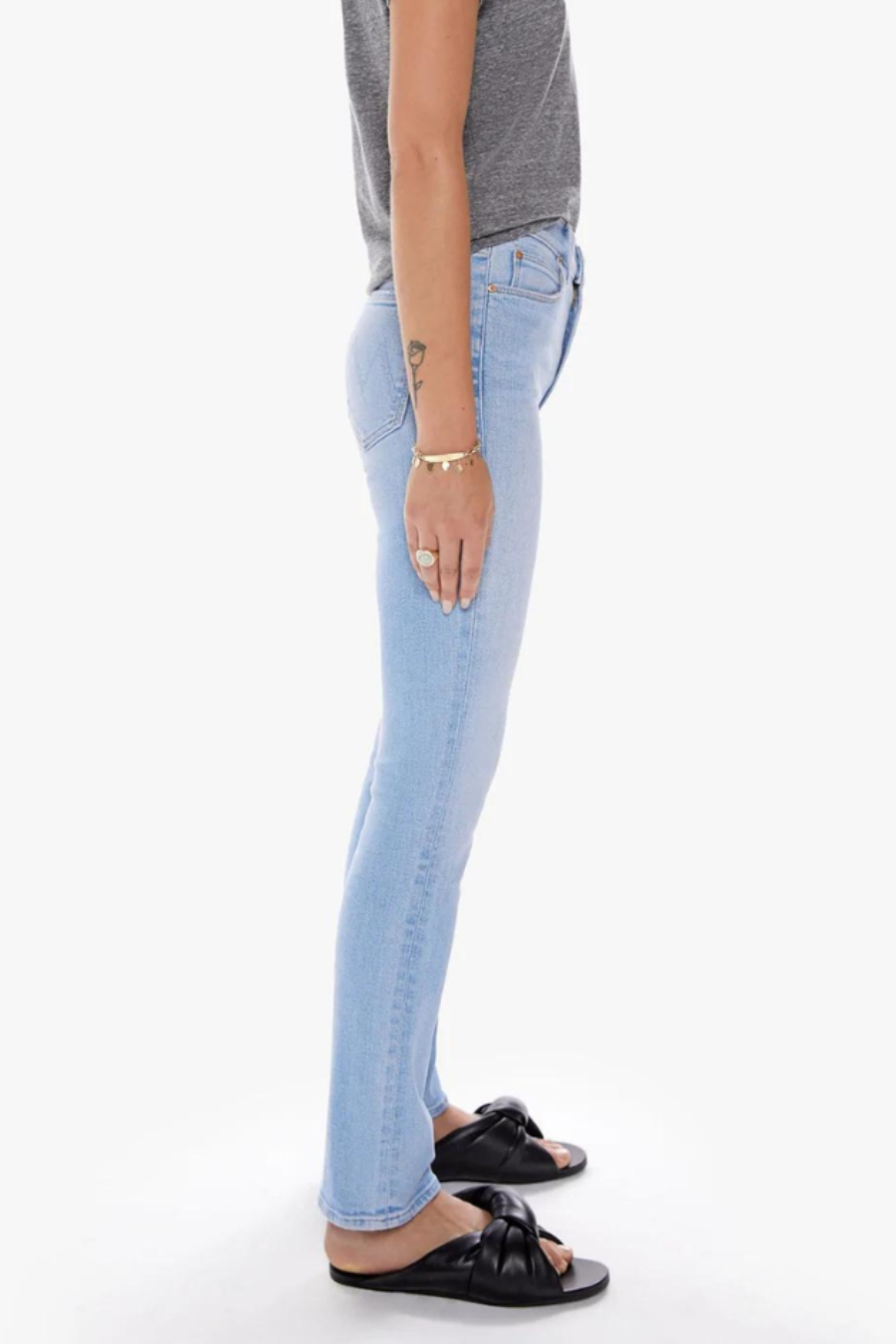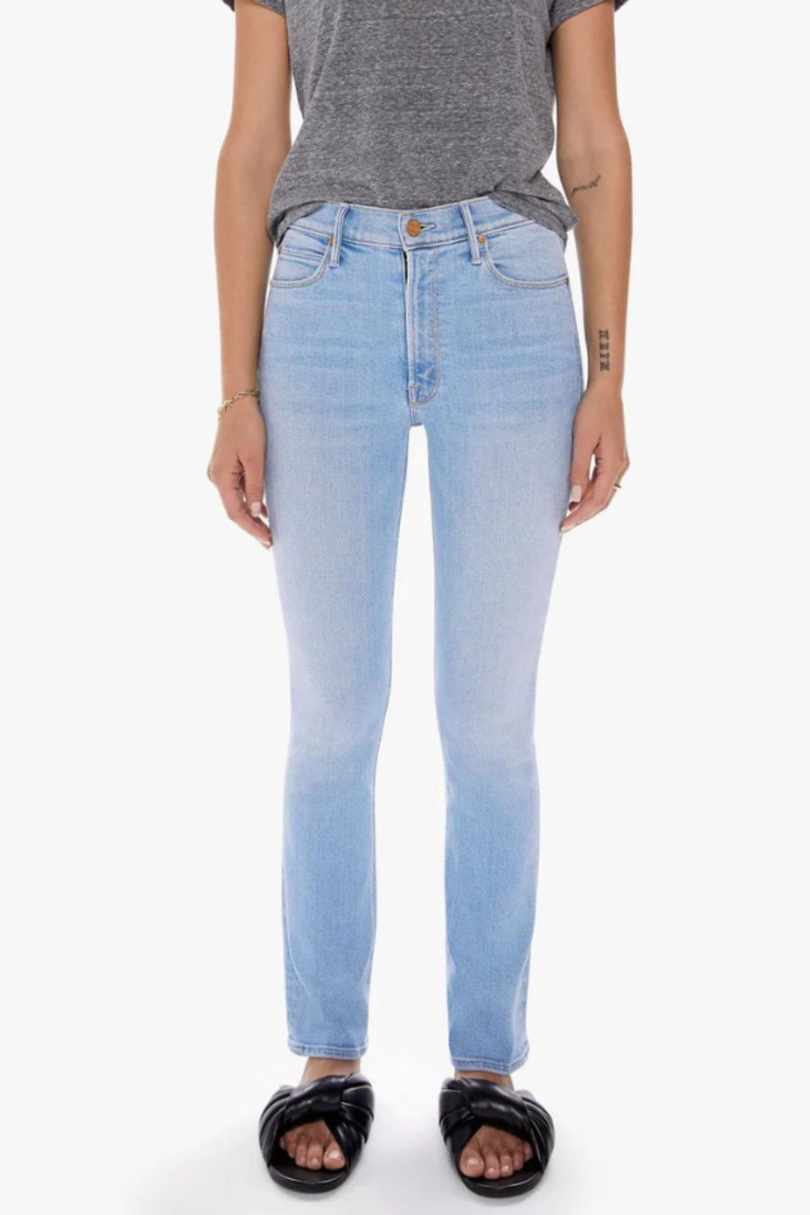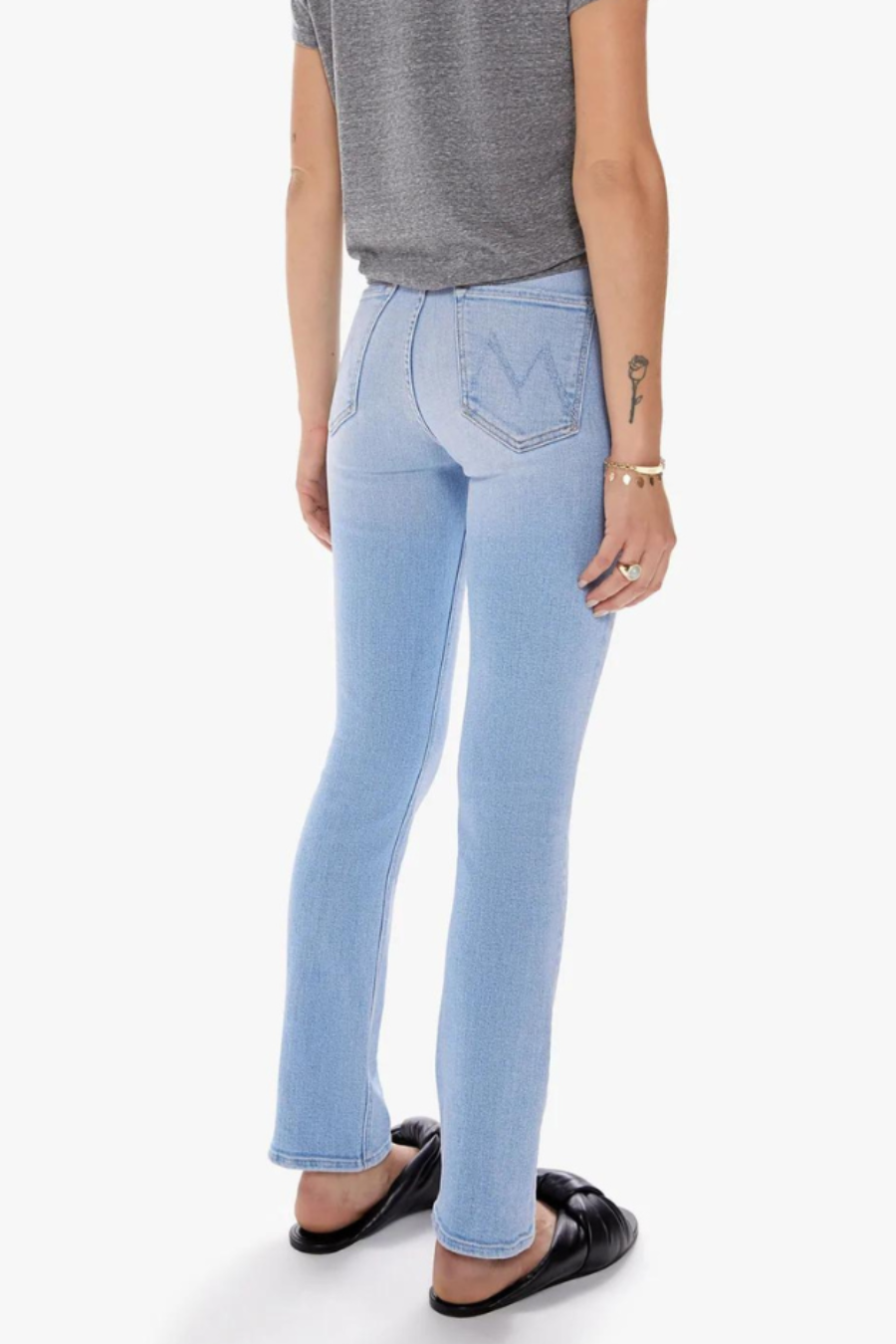 Now you see me, now you don't. The popular mid-rise straight leg hits at the ankle with a clean hem. Cut from denim with a touch of stretch, In The Blink Of An Eye is a light blue wash with fading and whiskering. Think fast.