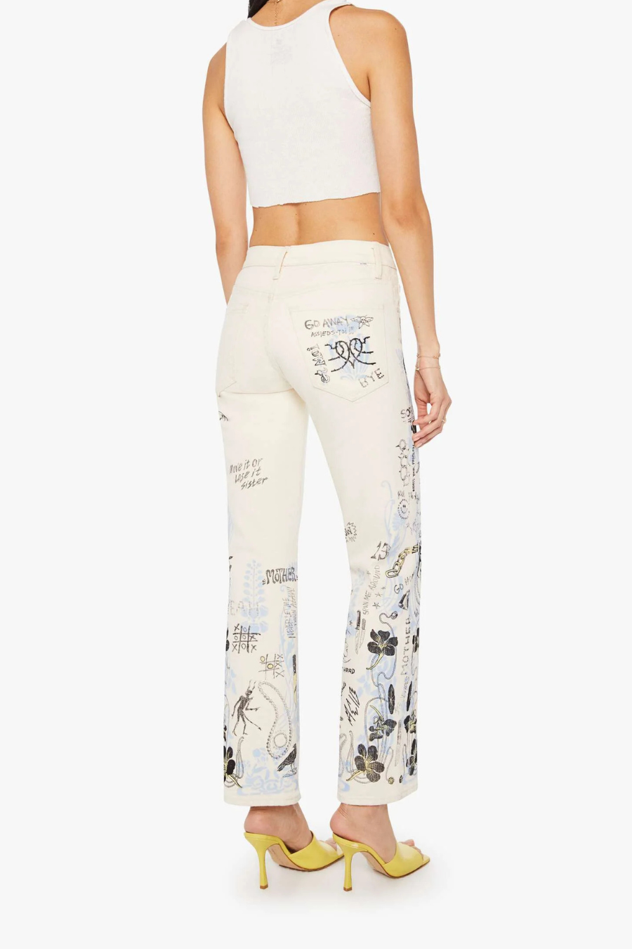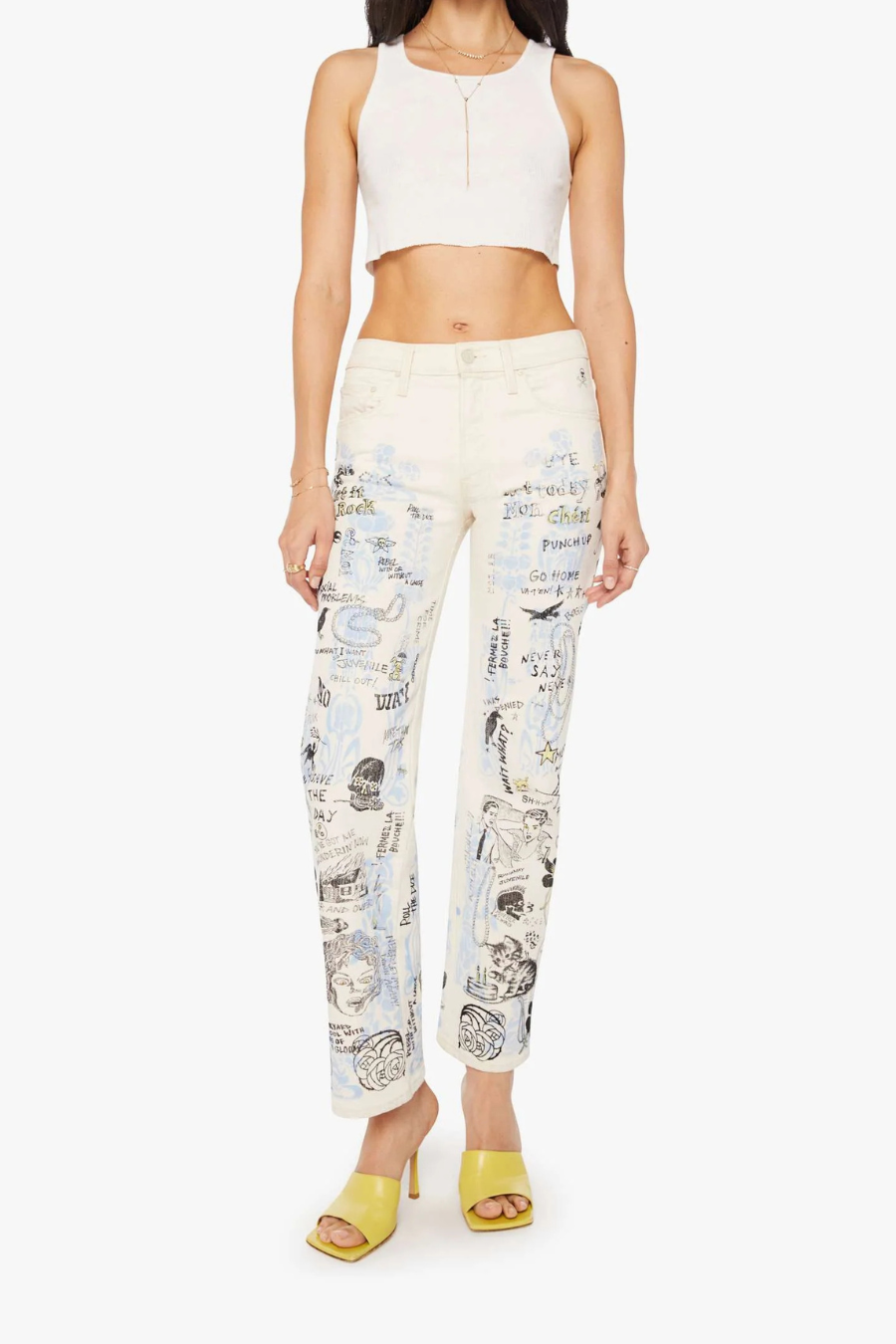 Nothing but trouble. Mid-rise jeans with a wide straight leg, zip fly and clean 30-inch inseam. Made from semi-rigid SUPERIOR denim, Bad Decisions Club is an off-white with hand-drawn text and doodles in light blue and black throughout.