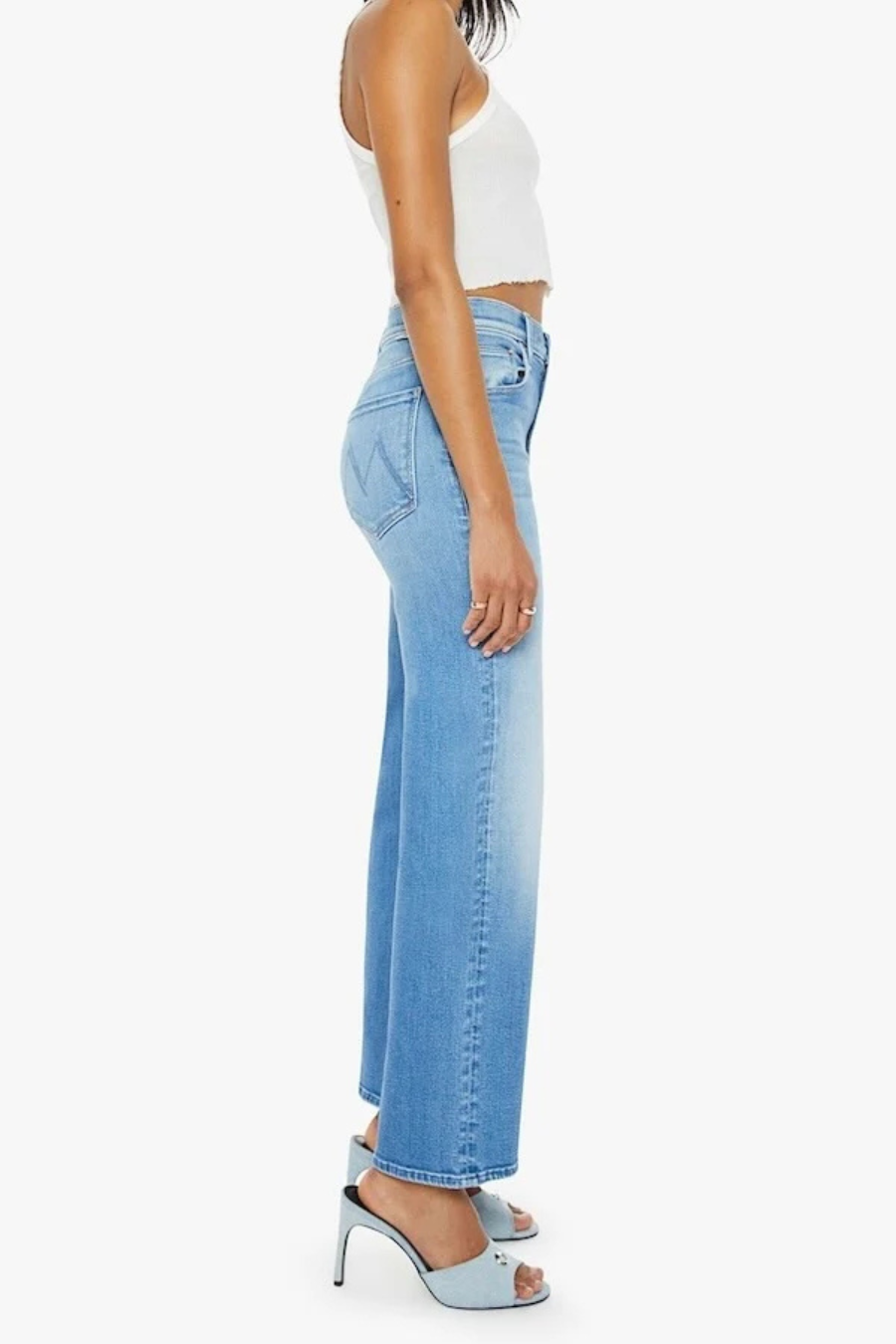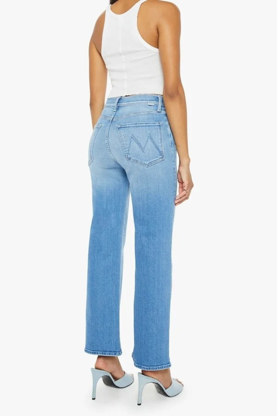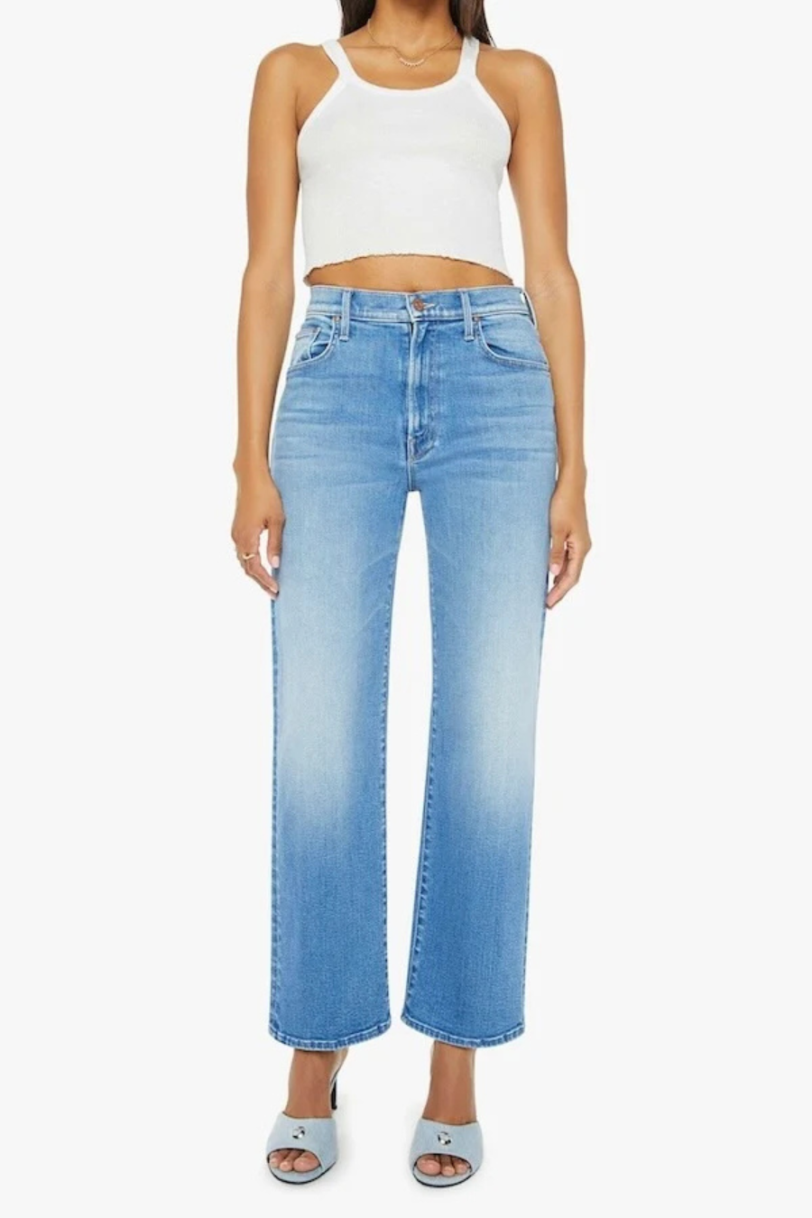 High-waisted jeans with a wide straight leg, zip fly and clean 28.25-inch inseam. Made from stretch denim, Read Between The Lines is a mid-blue wash with whiskering and fading at the knee.