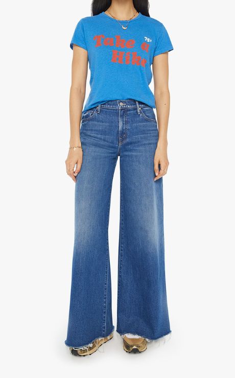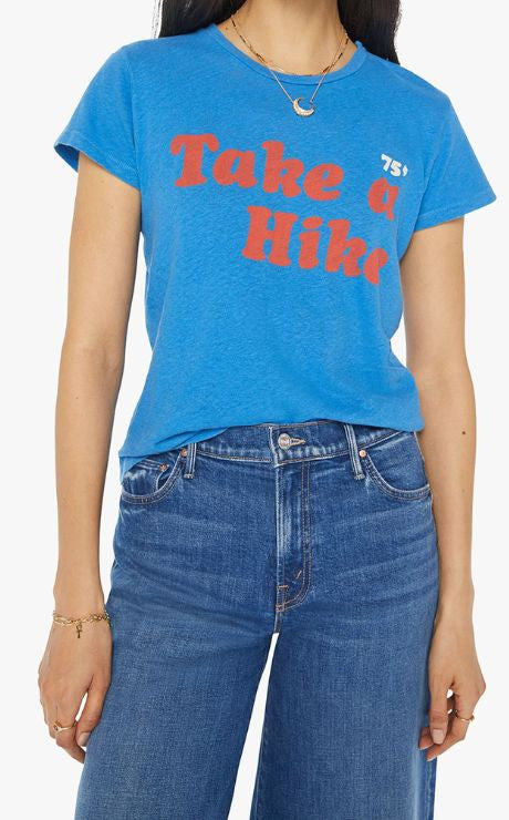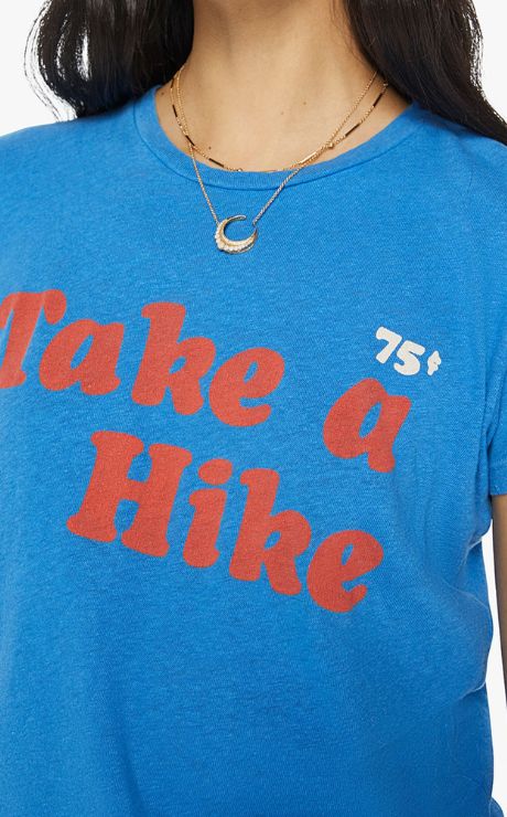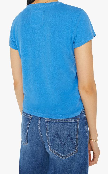 Hit the road. A soft crewneck with a slim fit for a vintage look and feel. Made from a SUPERIOR blend of cotton and linen in blue, the tee features a subtle message from MOTHER in red on the front.