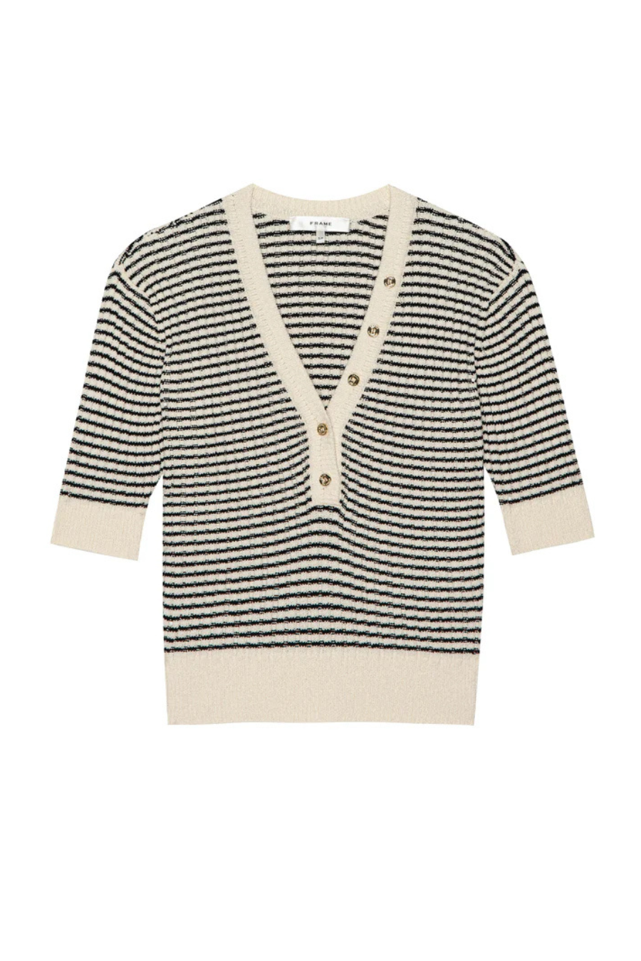 Bring a splash of fun to your wardrobe with the Frame Stripe V-Neck Sweater in Cream Multi. Cozy yet chic, its vibrant stripes add a playful twist to any outfit, making chilly days feel a little brighter.