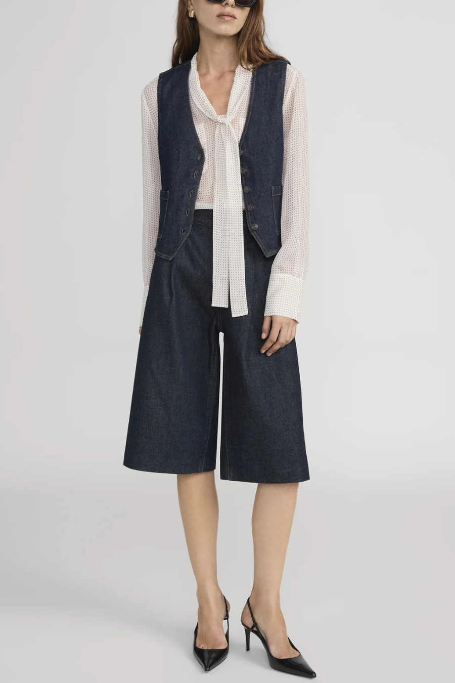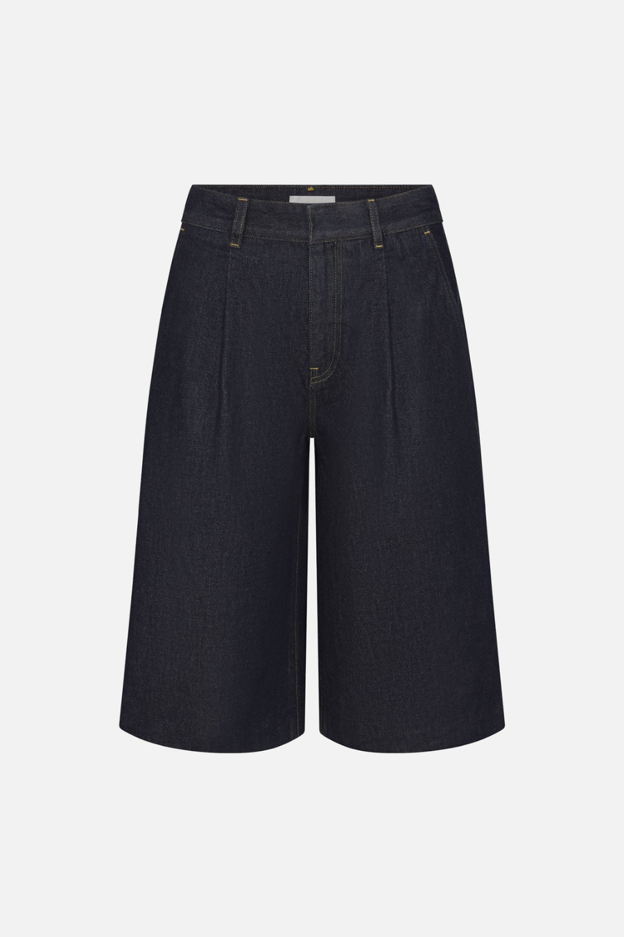 This short is tailored in regenerative non-stretch denim for a classic, structured silhouette. Hits mid-knee and features pleats at the top. Pair with The Denim Vest for an effortlessly polished ensemble. In Rinse, a rich deep indigo wash.