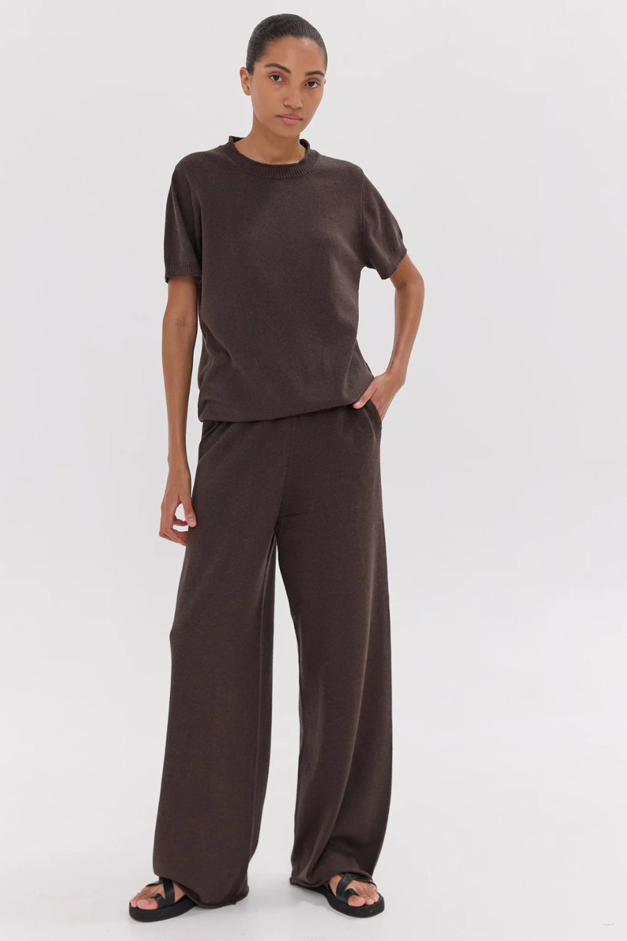 Crafted from 95% GOTS certified organic cotton and 5% cashmere, the Travel Pants are designed for effortless comfort with a refined finish. The soft knit drapes fluidly with a natural stretch, creating a relaxed silhouette that feels polished yet easy. Featuring an elasticated waistband, straight leg, and side pockets, they’re a versatile essential — perfect for travel, long days, or paired with coordinating knitwear for a considered look from home to out and about.