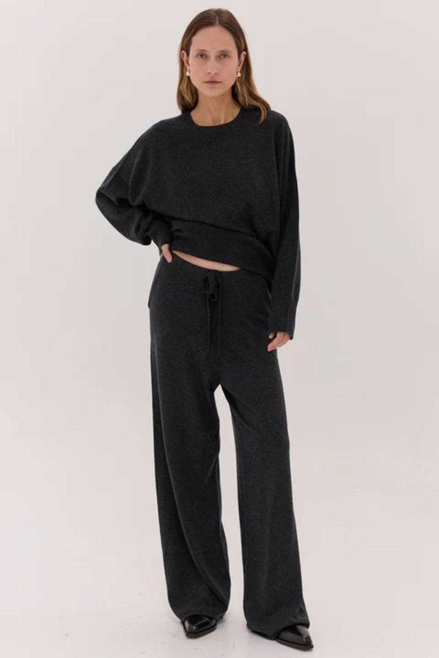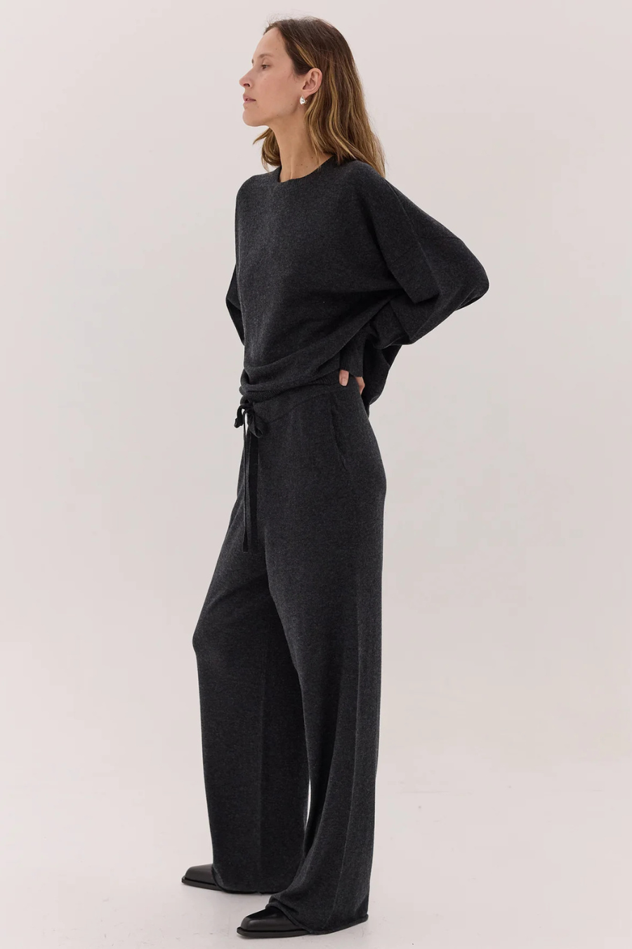 Featuring a relaxed, tapered silhouette with an elasticated waistband and adjustable drawcord, they deliver a flattering fit without compromising on comfort. Finished in Charcoal — a deep, versatile grey — they pair effortlessly with everything from our matching sweater to a crisp shirt or oversized coat.