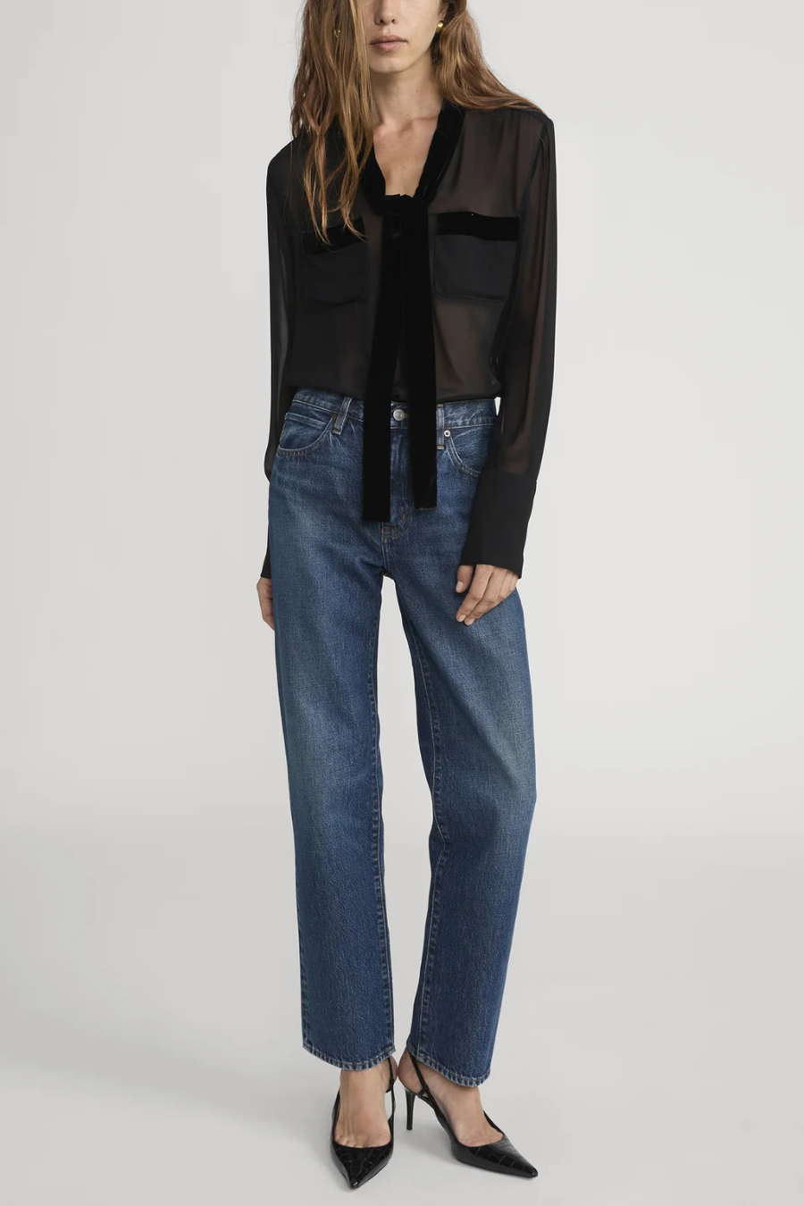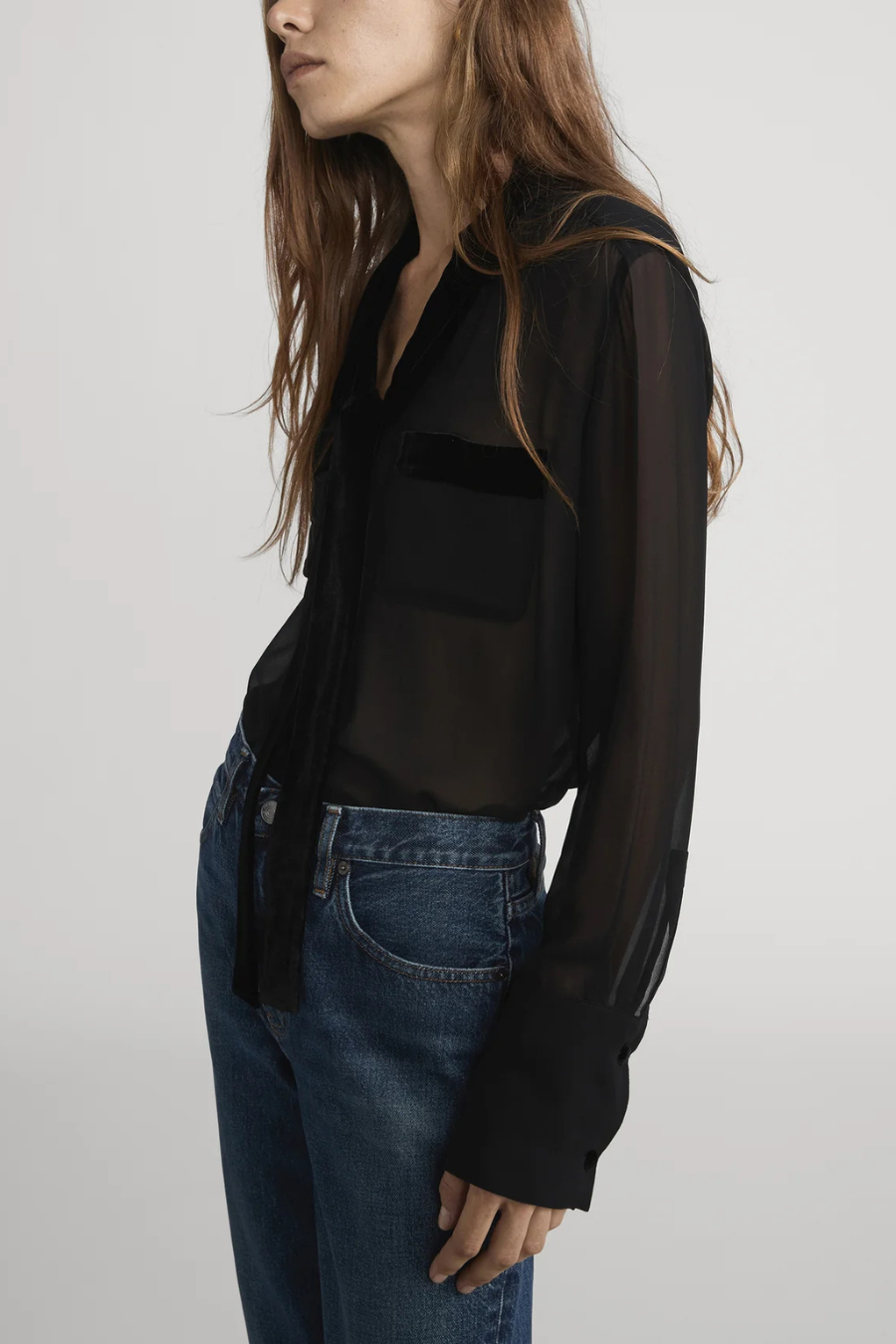 This feminine blouse is crafted from sheer black silk and elevated by soft velvet trim along the tie and front patch pockets. With long, graceful sleeves and a light, airy quality. A subtly sexy top to reach for again and again.