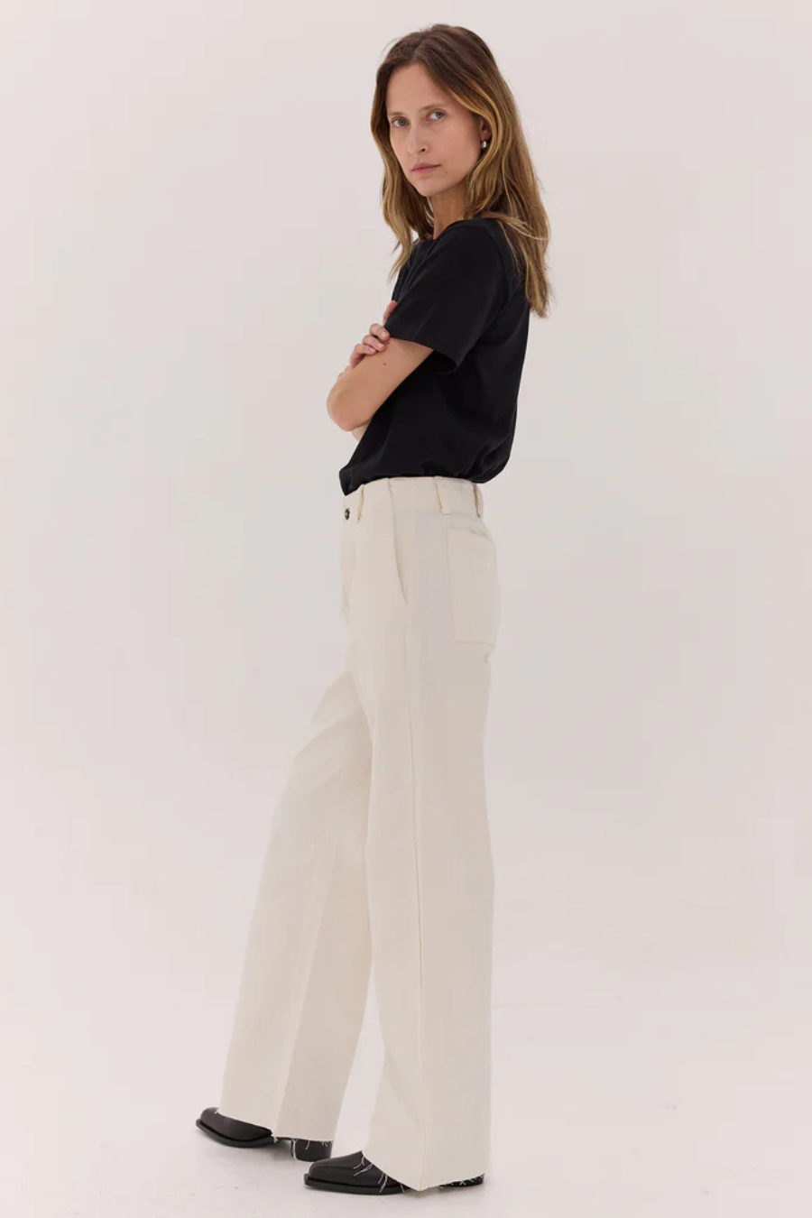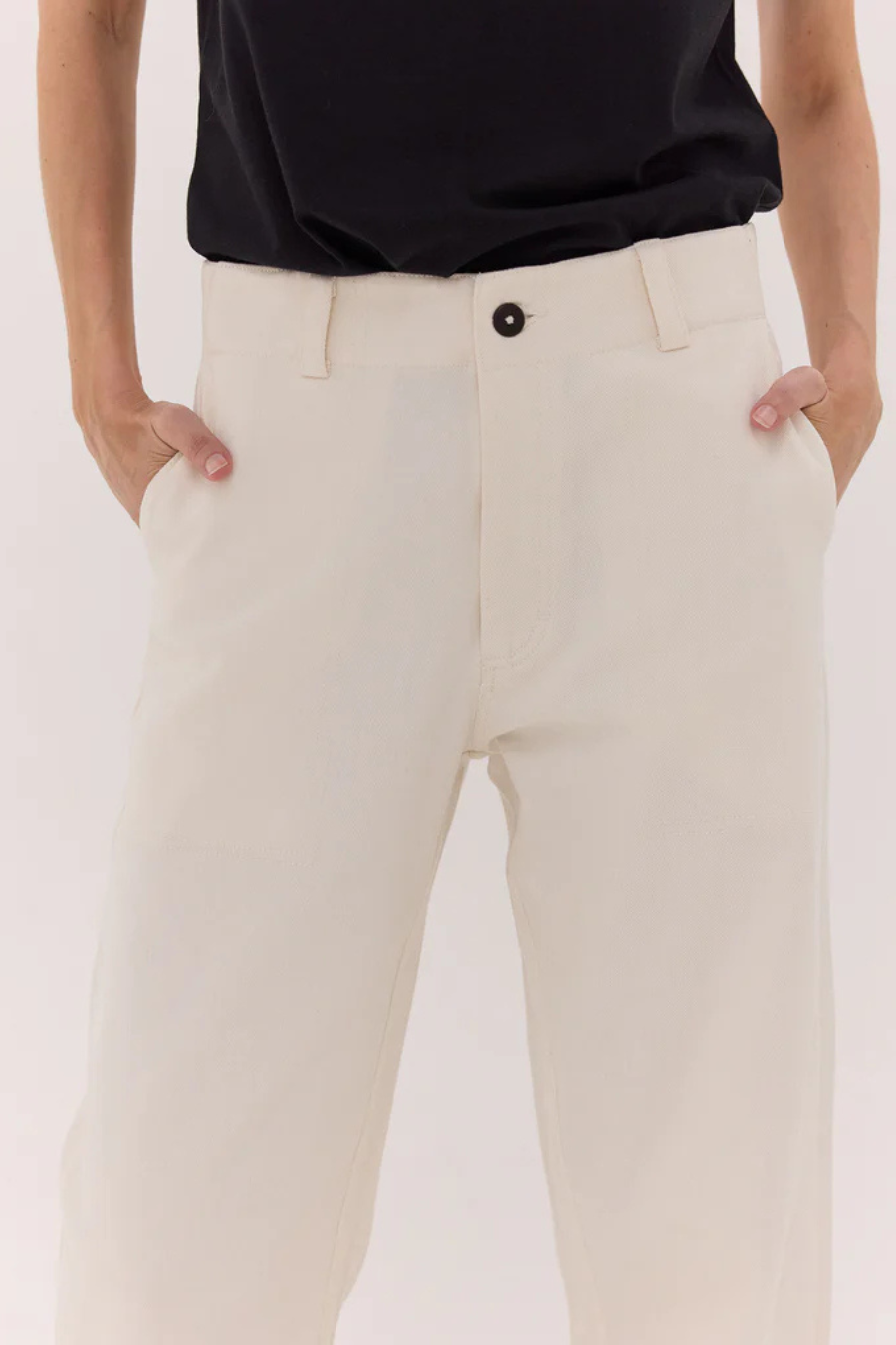 Crafted from organic cotton denim, these wide-leg jeans feature a raw hem that can be cut to your desired length. With a corozo button, zip closure, and pockets, they offer a modern, customizable fit with sustainable style.