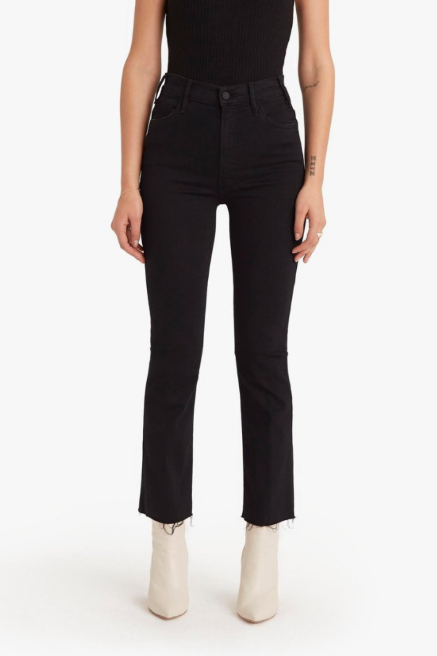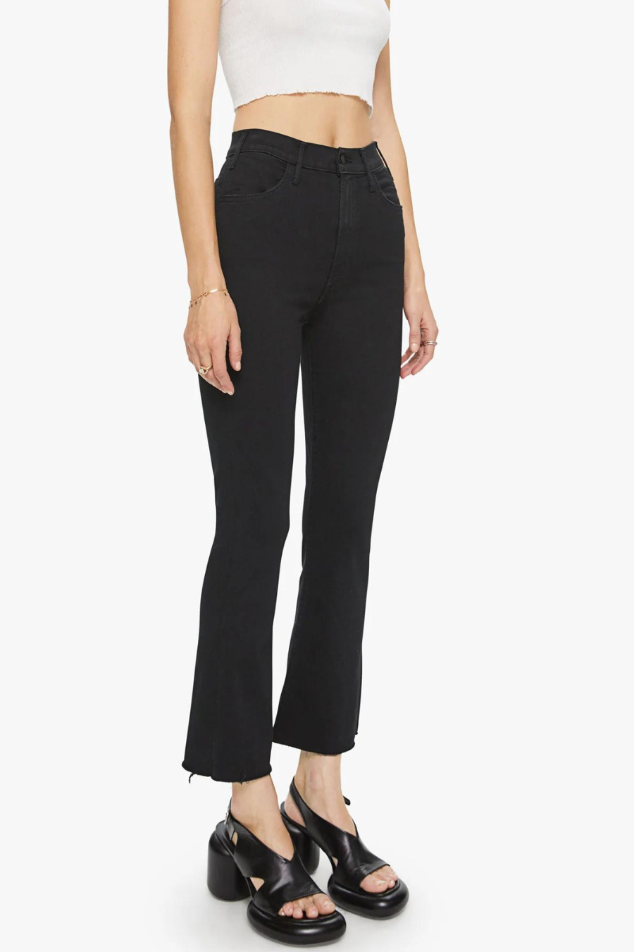 The Hustler Ankle Fray Jean is MOTHER's favorite vintage-inspired high rise fit with cropped boot cut legs. Not Guilty is our classic black denim wash. Made in Los Angeles.