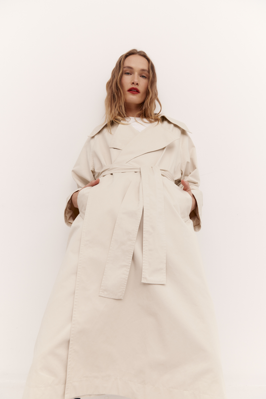 The Trench Coat is meticulously crafted from 100% cotton drill, known for its beautifully soft feel, making it an ideal choice for everyday wear. This versatile piece showcases an oversized silhouette, complete with tie-waist detailing, two front pockets, and a full lining in our signature monogram fabric.