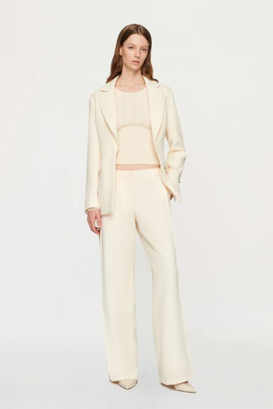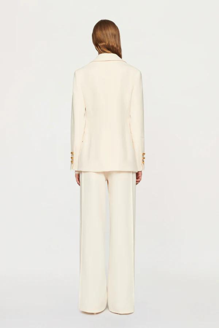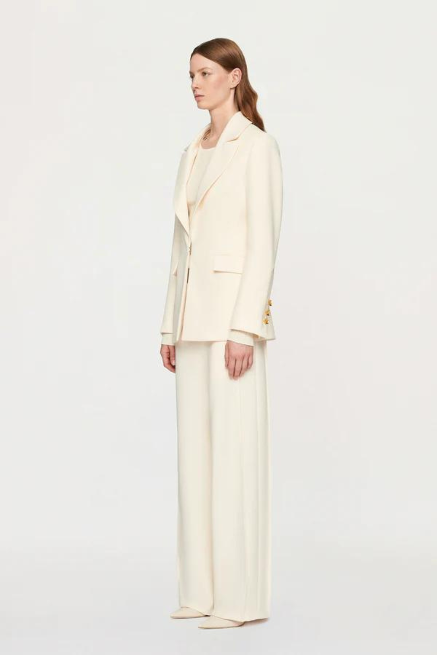 Beautifully crafted in a stunning bonded crepe fabrication in our timeless bone hue. This edge to edge jacket features special hook for clean closure.