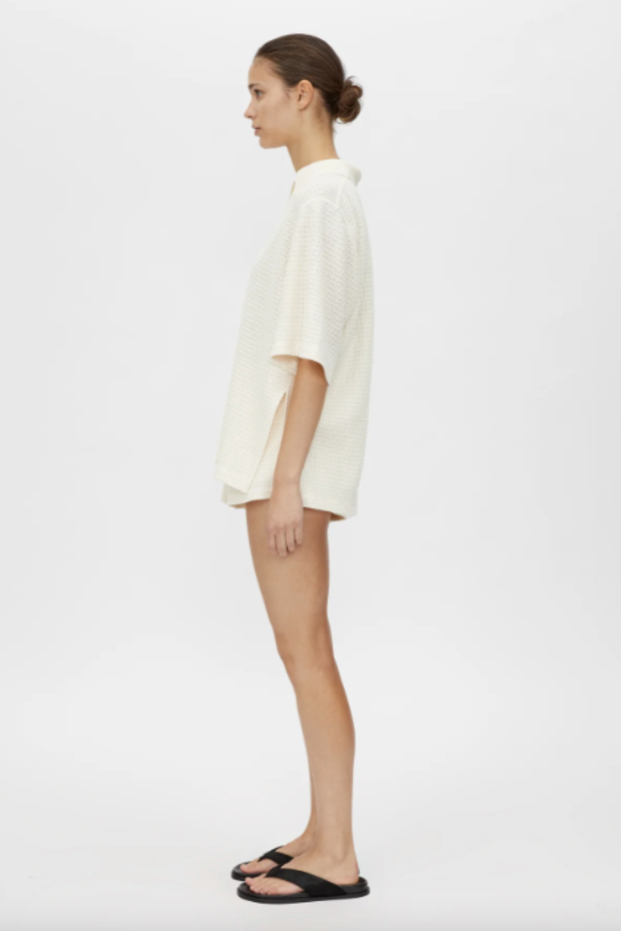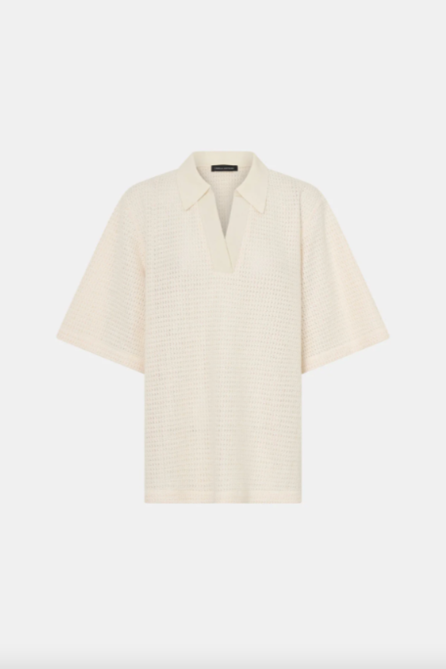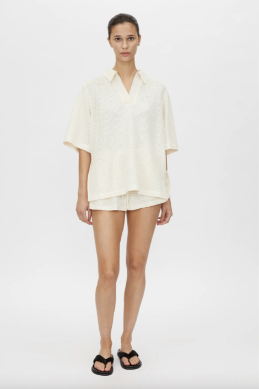 Turrell oversized textured tee with trophy rib collar. Wide short sleeves, side splits.