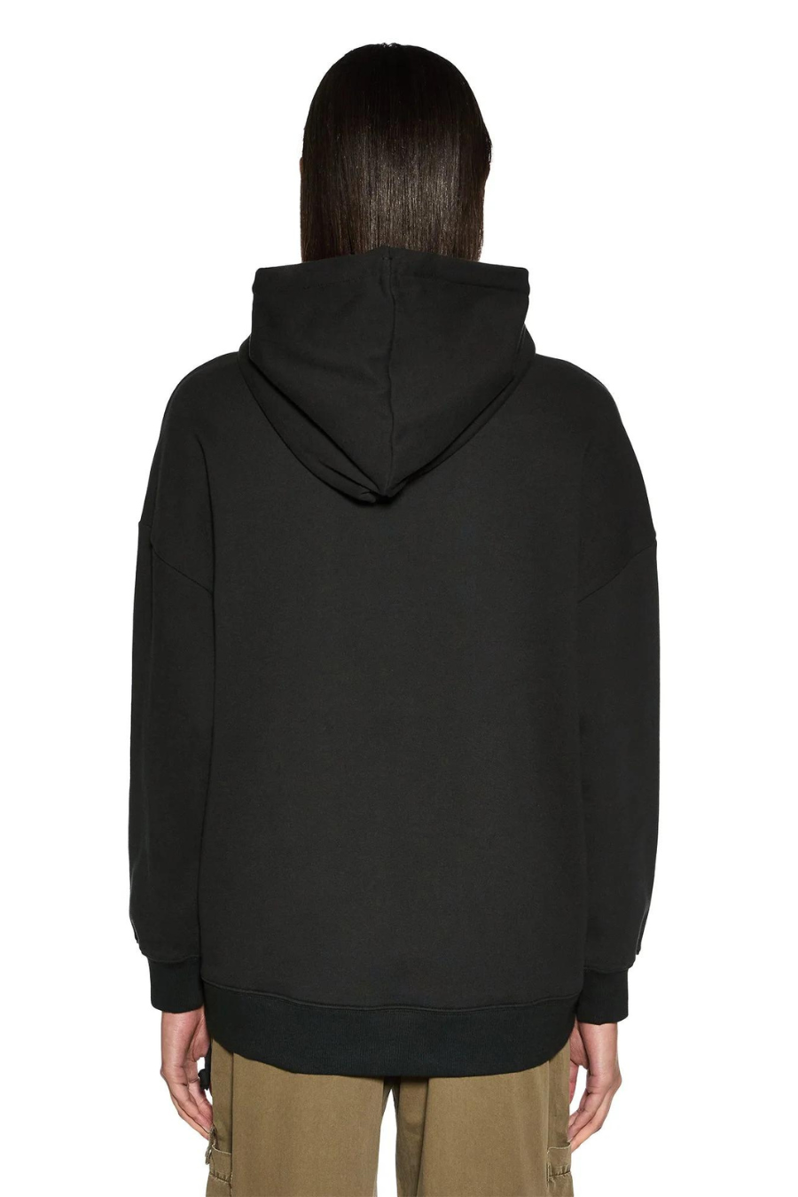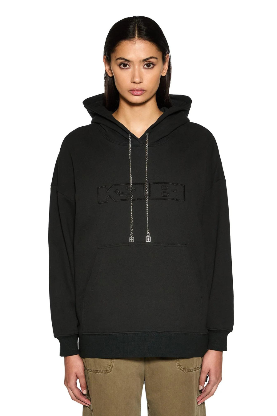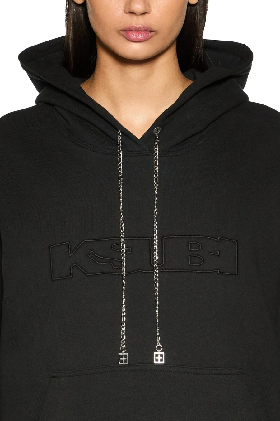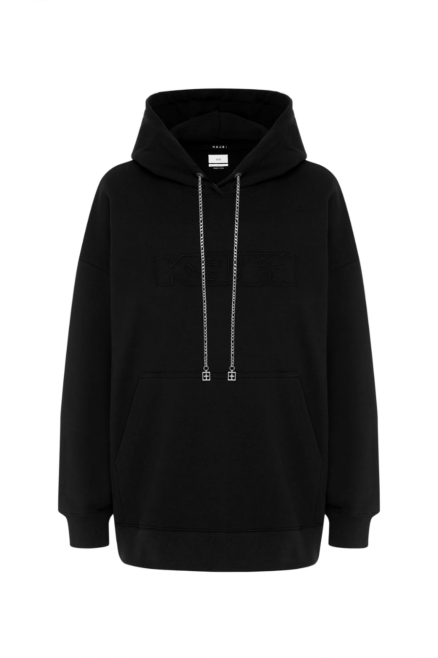 The Unchained Oh G Hoodie Black is an oversized hoodie with a dropped shoulder, long sleeves, and ribbed cuffs, crafted from premium loopback cotton fleece in black. It features a metal chain drawcord with T-box charm ends, a front pouch pocket, tonal SOTT outline embroidery on the chest, and T-box embroidery on the back.