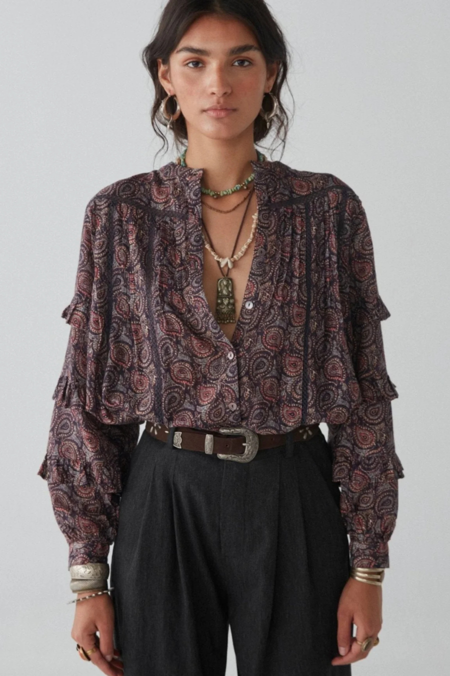 Crafted from Luxurious cotton, the Venice Blouse features a moody blend of midnight hues with intricate paisley patterns that evokes the mystique of Renaissance.