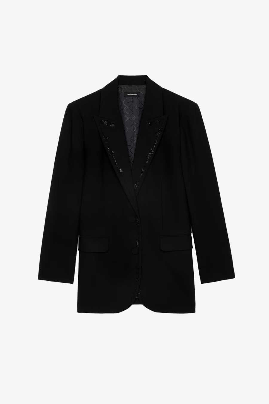 - Notch lapel collar, edges and cuffs adorned with rhinestones