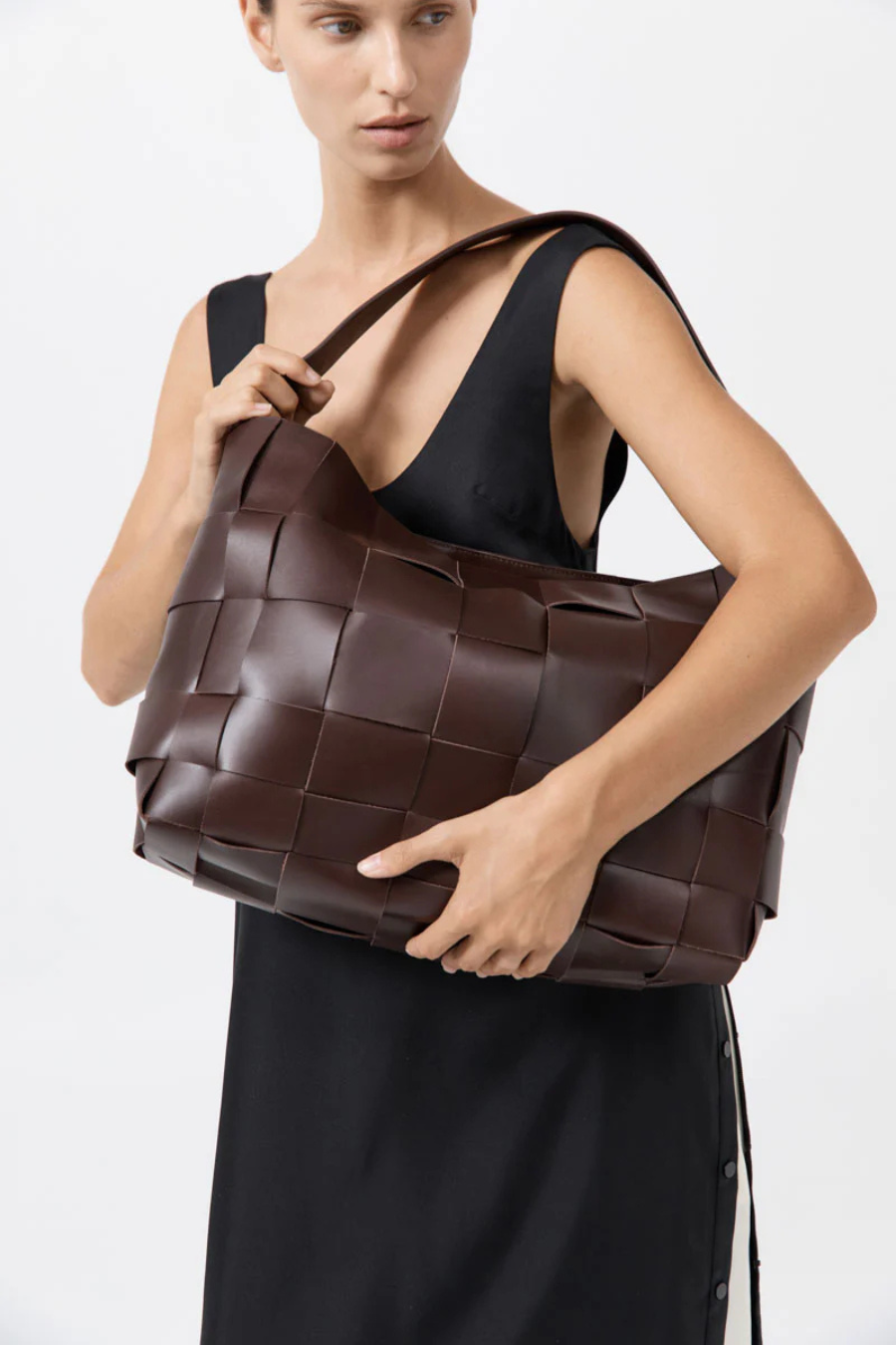 - Woven leather body, single shoulder strap, tote silhouette, internal pocket