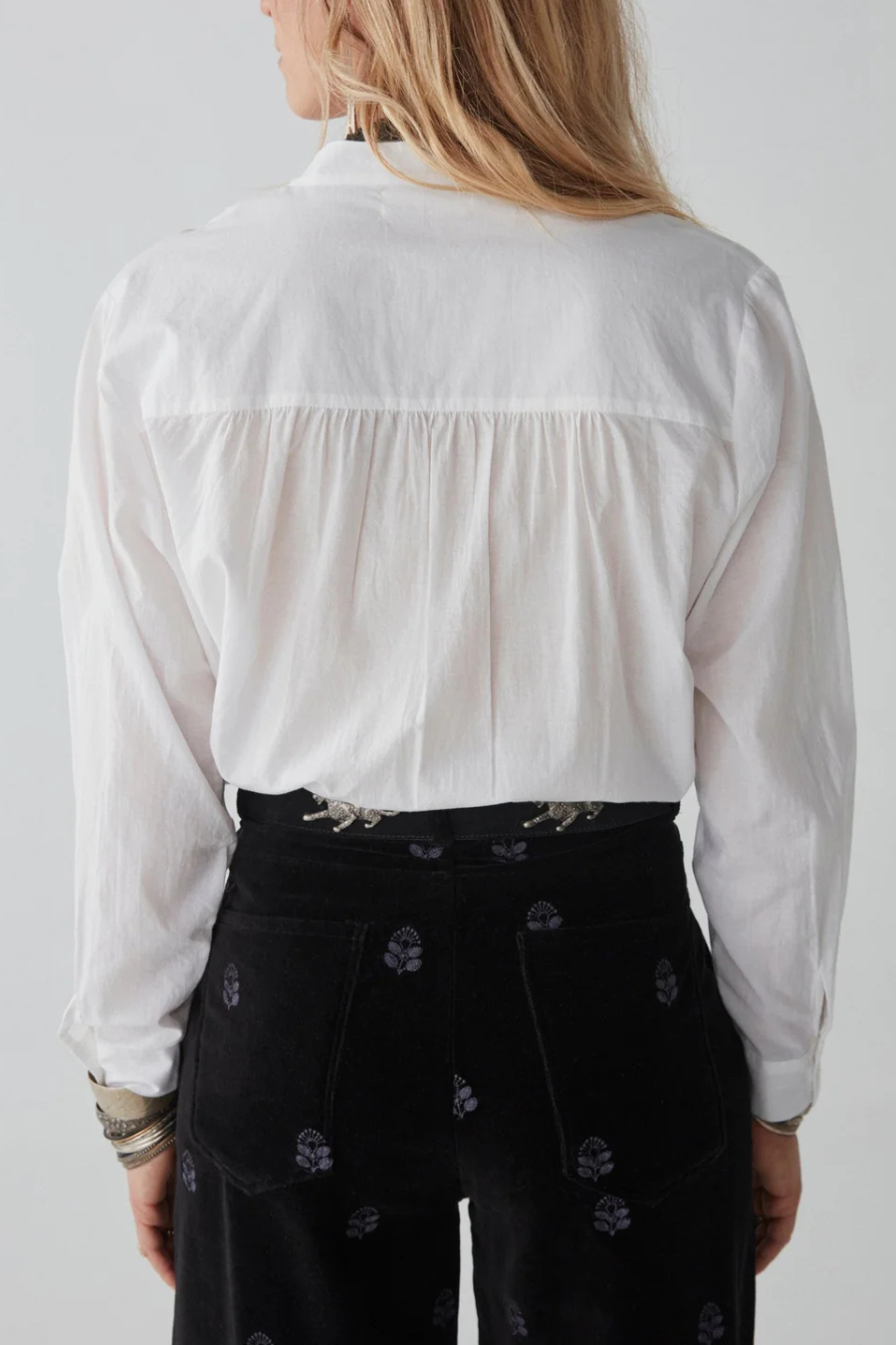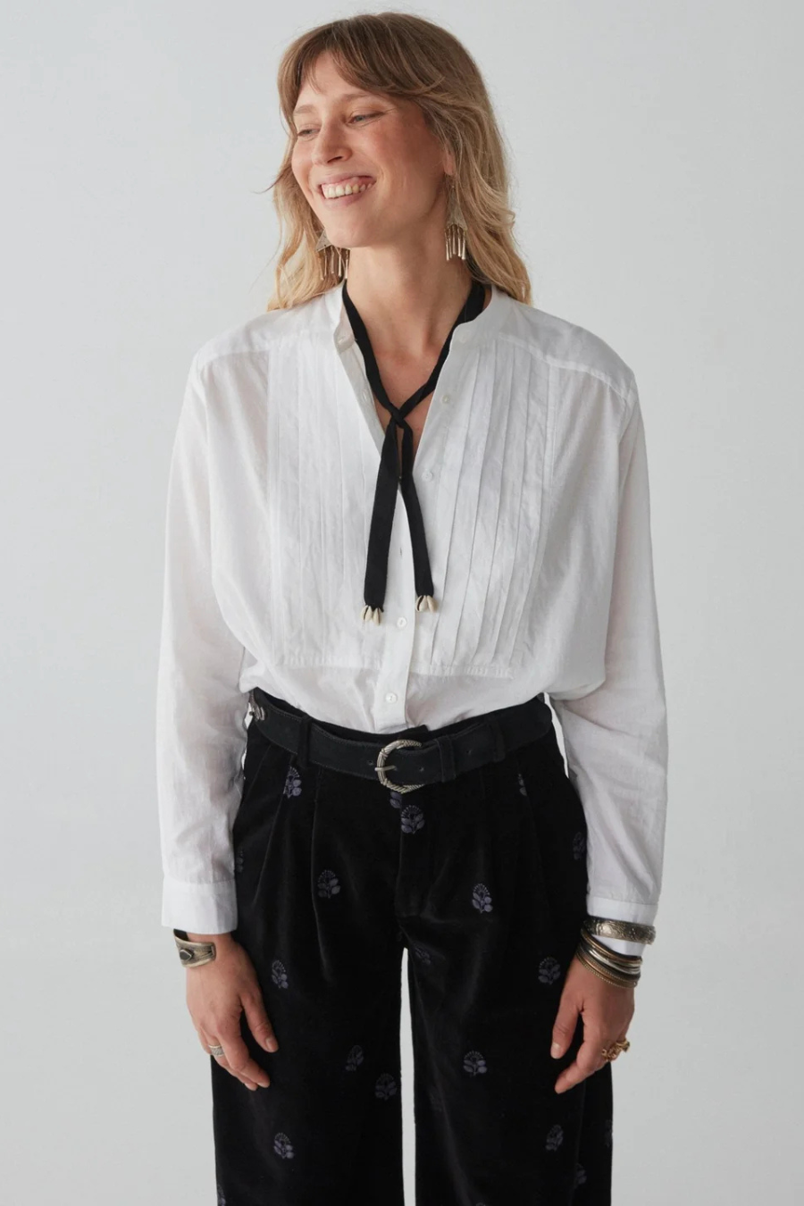 The crisp white cotton, pleated to perfection, feels as though it was crafted for moonlit musings and rebellious hearts. Its mandarin collar, simple yet profound, frames the neck with quiet elegance, allowing the boldness of your accessories to sing. The sleeves, lightly billowed before tapering at the cuffs, provide a balance of structure.
