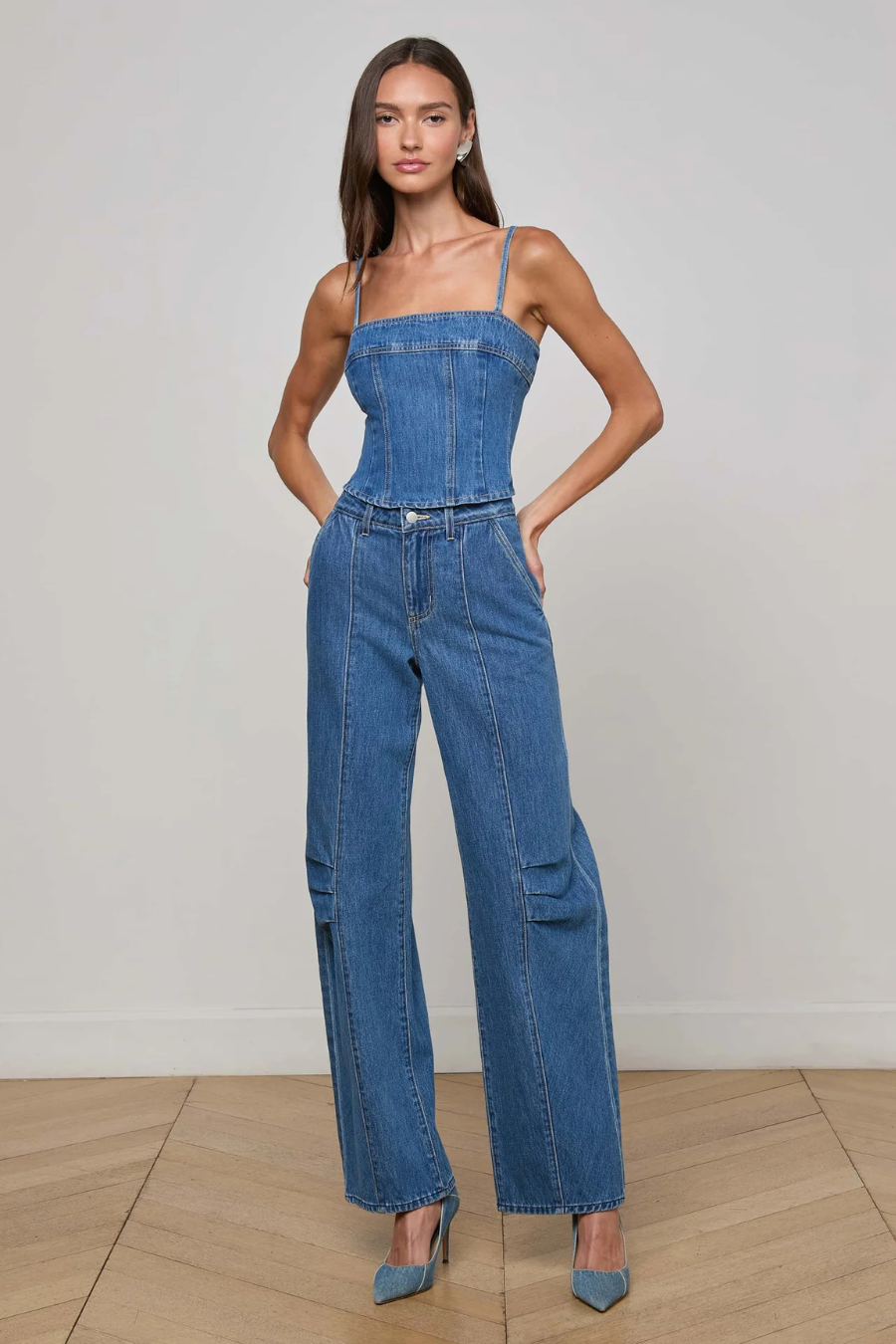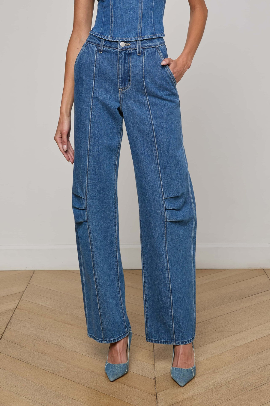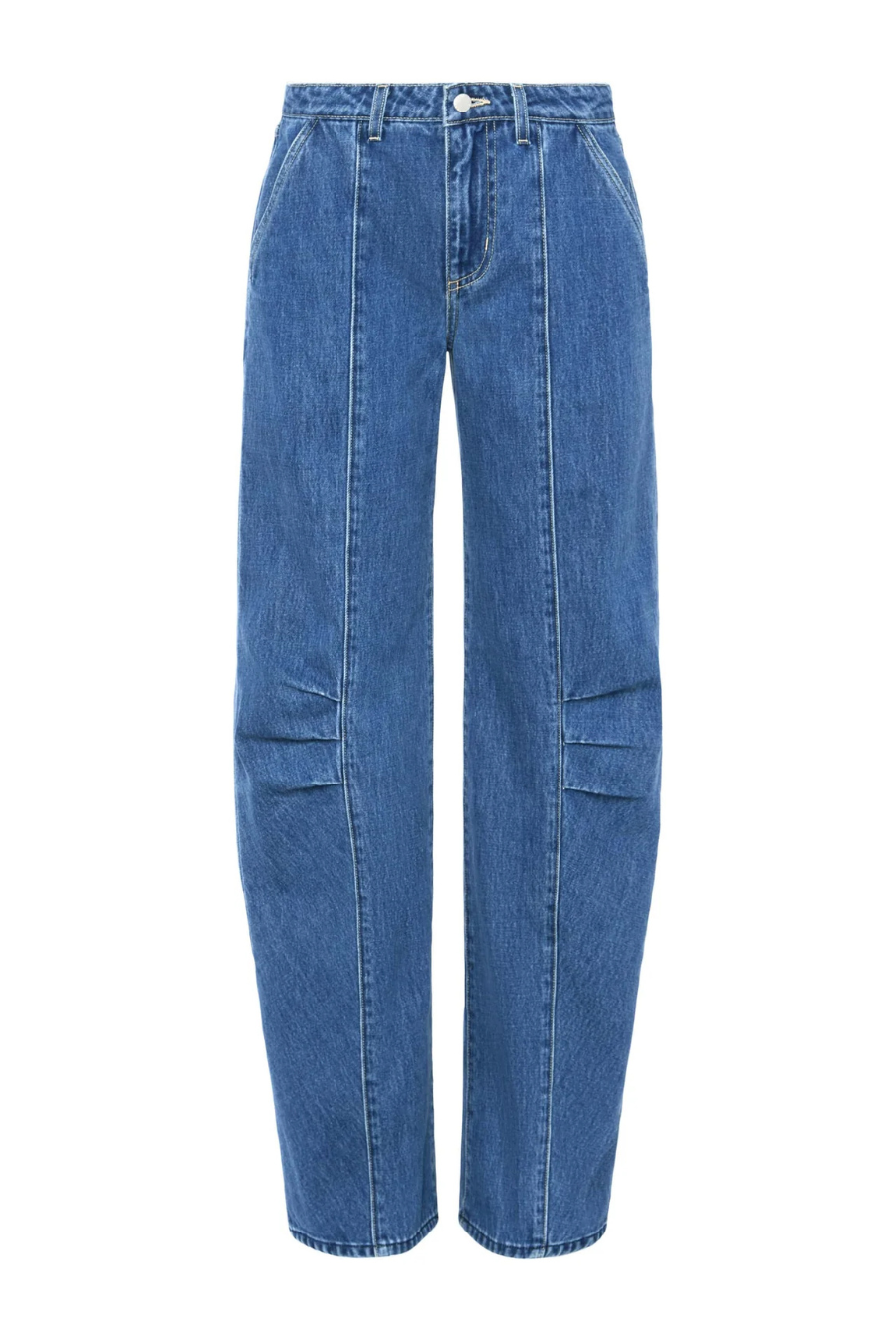 Introducing Zara, the signature barrel-leg jean in a full-length inseam. The relaxed fit sits comfortably at the natural waist. Designed with front seams and pleating details at the knees that add subtle structure, it blends trend-setting style with a laid-back feel.